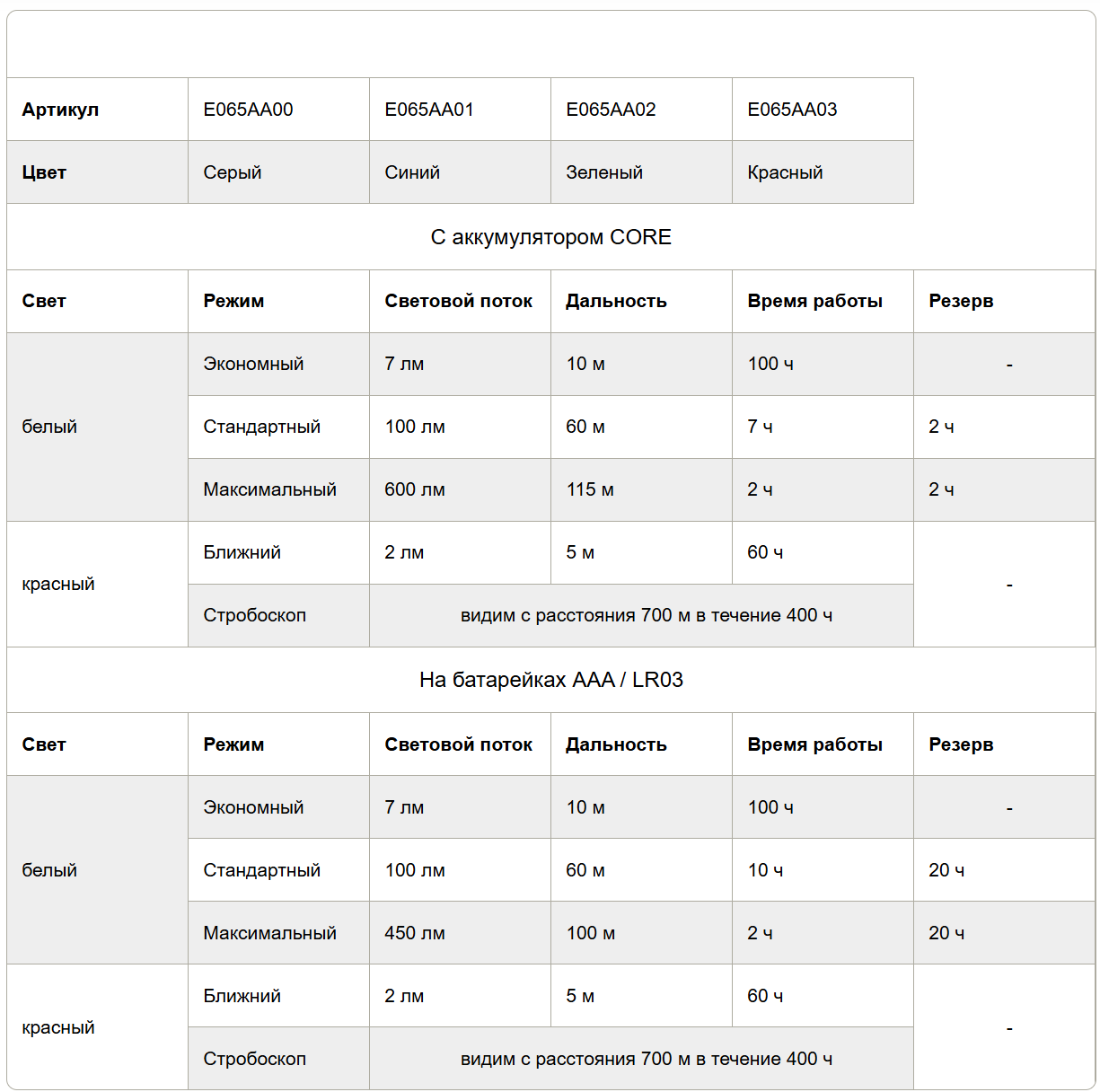 • HYBRID CONCEPT: ACTIK CORE поставляется в комплекте с перезаряжаемым аккумулятором CORE, но также может использоваться со стандартными 3 батарейками AAA/LR03. Фонарь автоматически определяет источник энергии и регулирует мощность освещения